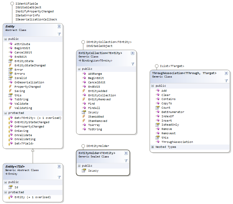 LightSpeed also includes a base Entity framework that assists in the creation of effective .NET domain models. Central to the framework is of course the Layer Supertype Entity<TId> base class. This class handles, among other things, state tracking and validation and also implements the key databinding interfaces: IEditableObject, INotifyPropertyChanged and IDataErrorInfo. Other key classes include EntityCollection and EntityHolder which are used to declare one-to-many and many-to-one or one-to-one associations respectively. The class diagram below shows the key classes making up the LightSpeed entity framework.